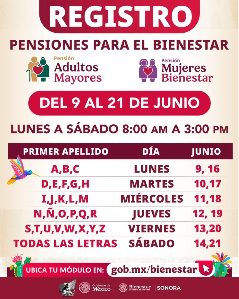 Del 09 al 21 de junio se abre la convocatoria para registrarse en Sonora a las Pensiones de Adulto Mayor y Mujeres Bienestar, anunció el Delegado de Programas para el Bienestar en el Estado, Octavio Almada Palafox.